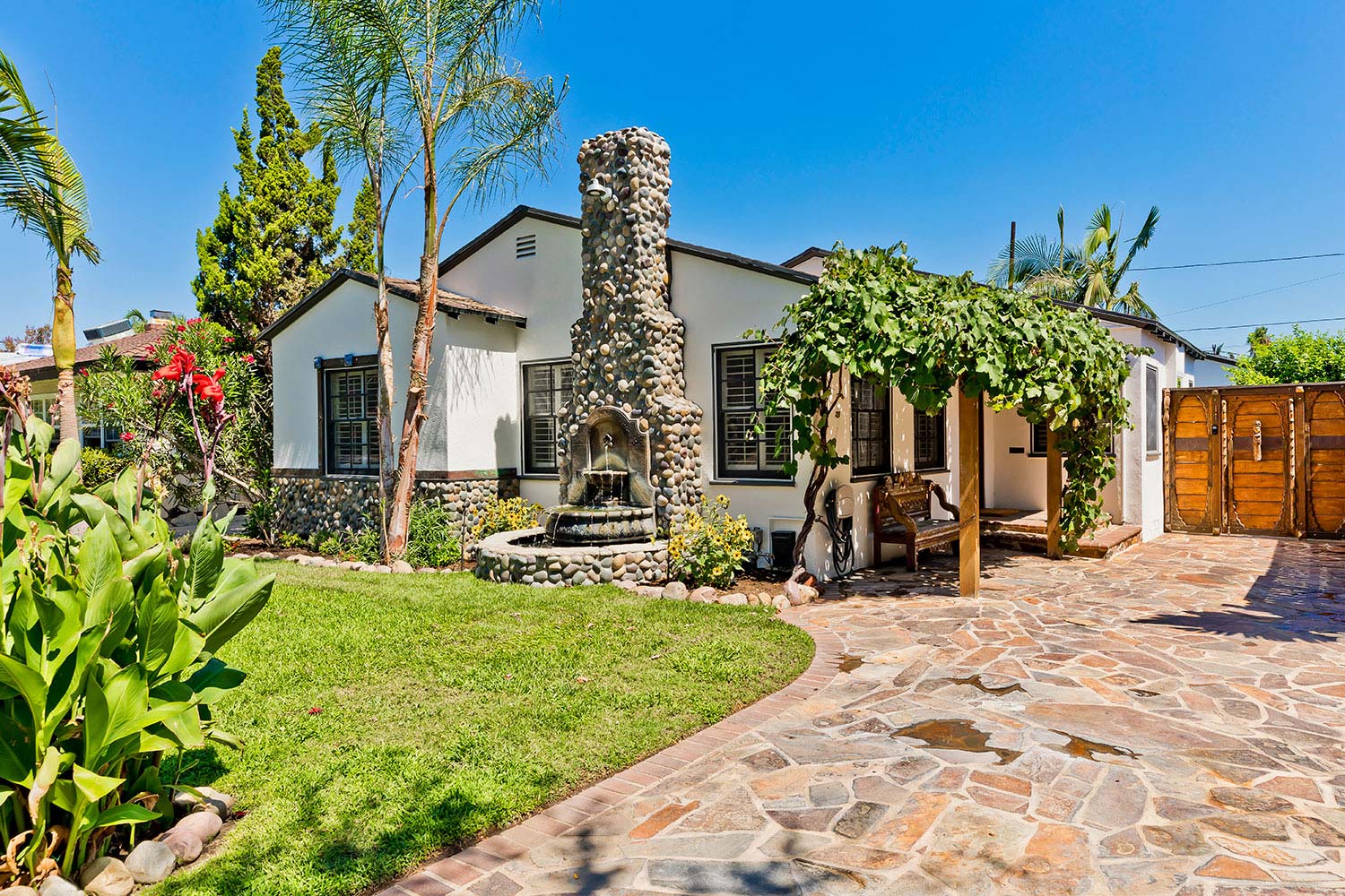 A private oasis complete with a sparkling lagoon pool, cascading waterfalls, relaxing spa tub, barbecue area, and outdoor cabana shower- perfect for entertaining. A flourishing vineyard entry welcomes you to a single story treasure on a tree-lined street in the delightful Toluca Woods neighborhood. Walk into a charming home with personality. The living room is decorated with a cozy fireplace which opens up to a dining room that takes you to the backyard, pool, and guest house. Newly renovated home with 2 spacious bedrooms and 2 full bathrooms in the main house and 1 bedroom 1 bathroom guest house. The guest house features a skylight, kitchenette, and full bathroom… perfect for in-laws and families with older children, that would prefer more privacy and separate entry. Just minutes away from shopping, restaurants, freeways, Universal Studios, Hollywood Bowl, and plenty of attractions. Tucked away in a very safe and quiet neighborhood. Enjoy the Toluca Lake lifestyle.